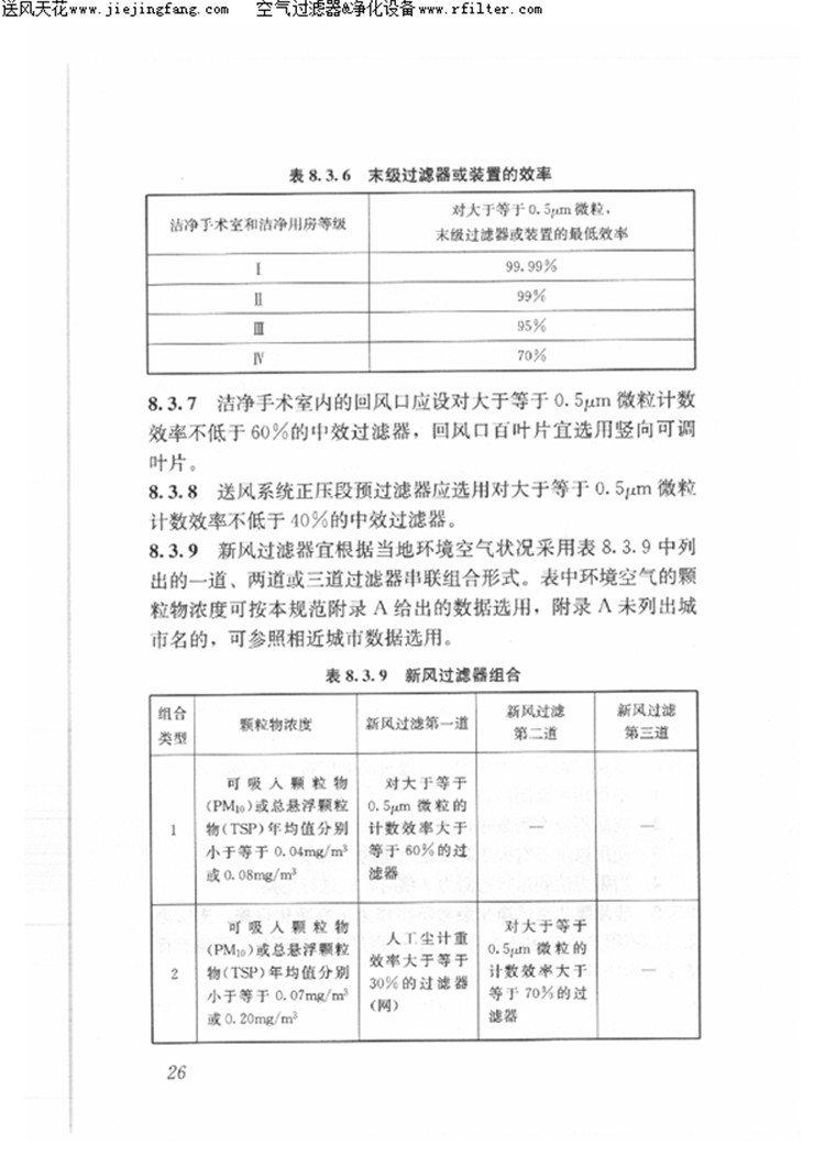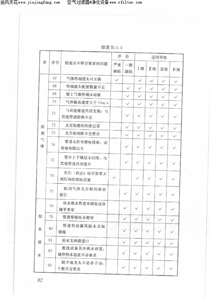 5、 净化空调系统强调了节能,给出了风机单位风量耗功率指标;增加了负压手术室的要求;增加了对送风状况的要求;增加了扩大集中送风面积的条件;提高了风速不均匀度的要求;增加末级过滤器装置以及新风过滤器组合的条件,提高了对围护结构、系统和过滤器安装严密性的要求。